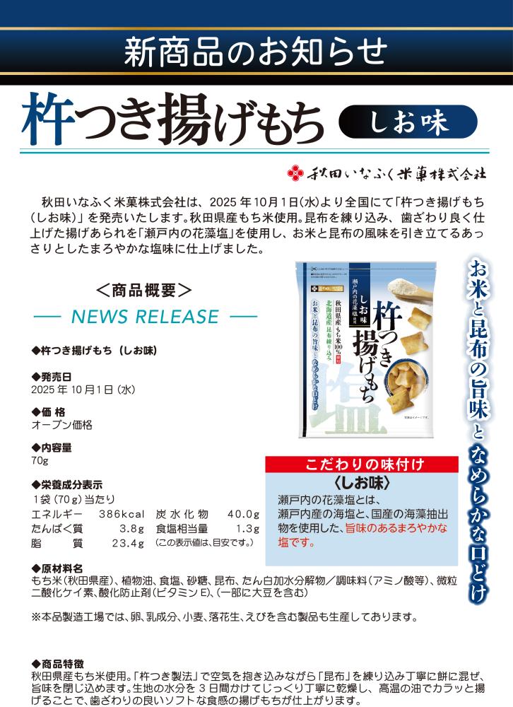 お知らせ ホームお知らせ10月発売 新商品のお知らせ「杵つき揚げもち(しお味)」 2025.09.30 商品情報 10月発売 新商品のお知らせ「杵つき揚げもち(しお味)」 秋田いなふく米菓株式会社は、2025年10月1日(水)より全国にて「杵つき揚げもち(しお味)」を発売いたします。秋田県産もち米使用。昆布を練り込み、歯ざわり良く仕上げた揚げあられを「瀬戸内の花藻塩」を使用し、お米と昆布の風味を引き立てるあっさりとしたまろやかな塩味に仕上げました。 (8.43MB) お知らせ一覧 ×