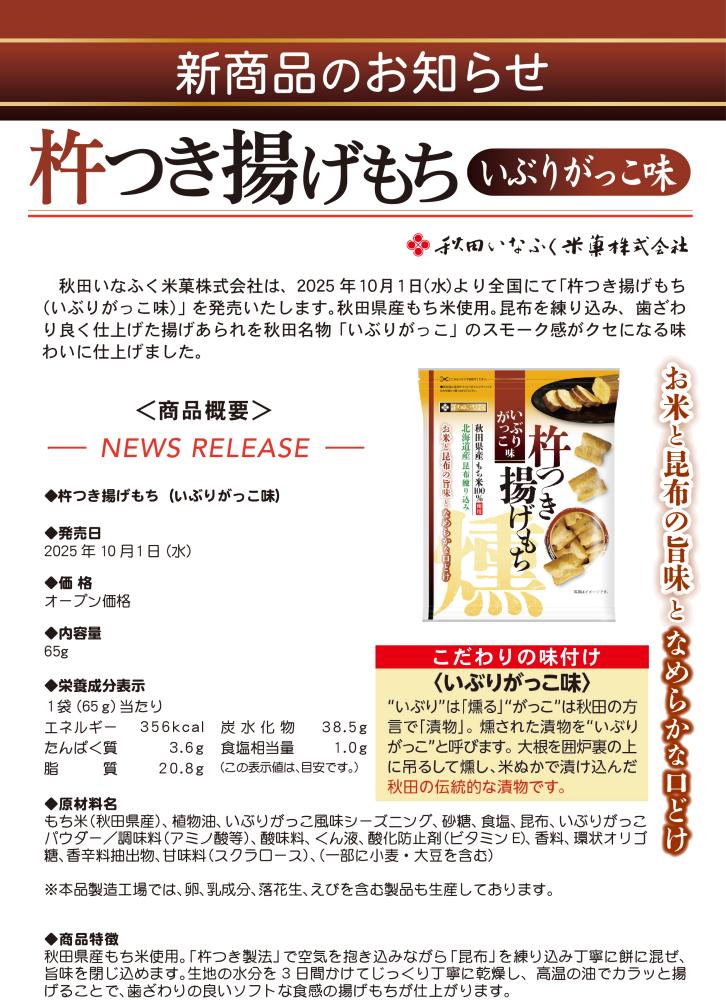 お知らせ ホームお知らせ10月発売 新商品のお知らせ「杵つき揚げもち(いぶりがっこ味)」 2025.09.30 商品情報 10月発売 新商品のお知らせ「杵つき揚げもち(いぶりがっこ味)」 秋田いなふく米菓株式会社は、2025年10月1日(水)より全国にて「杵つき揚げもち(いぶりがっこ味)」を発売いたします。秋田県産もち米使用。昆布を練り込み、歯ざわり良く仕上げた揚げあられを秋田名物「いぶりがっこ」のスモーク感がクセになる味わいに仕上げました。 (8.49MB) お知らせ一覧 ×